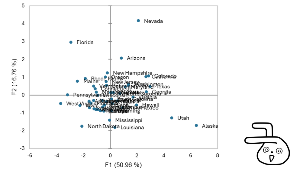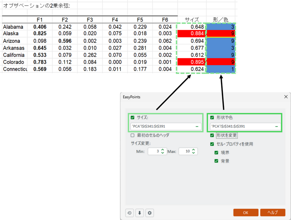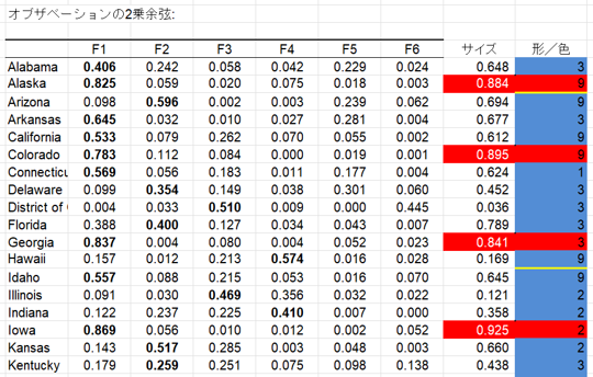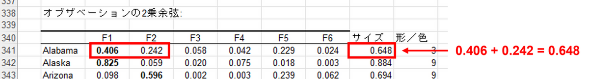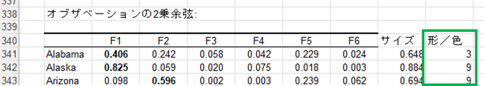 まず、[オブザベーションの2乗余弦] を利用して、各州がF1・F2 でどれだけ表現されているかをスコア化します。
