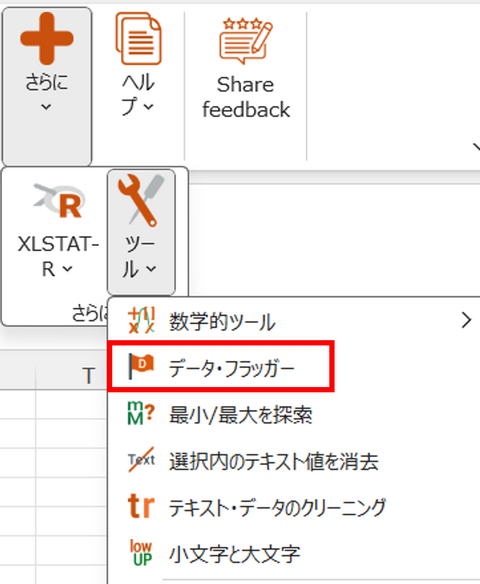 XLSTAT のメニューより[ツール]>[データ・フラッガー]を選択します。