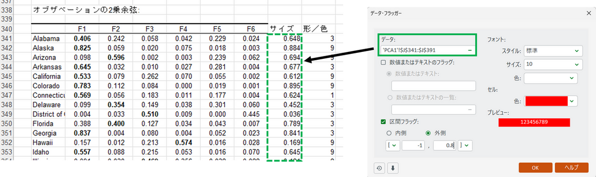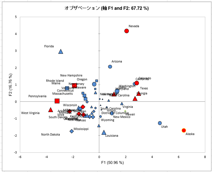 続いて、F1+F2 の値が大きい州は、前述の通り「2次元平面で良く説明されている」観測点です。これらを目立たせるため、フラッグ機能を使って条件に合致する観測点のみ赤く表示します。