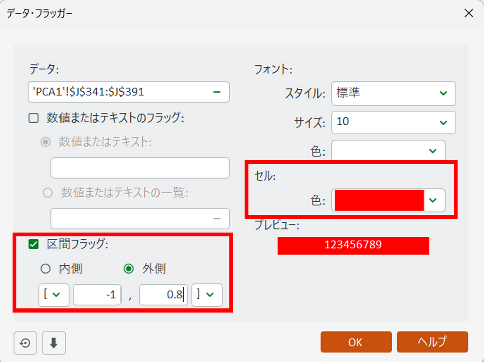 [外側]にチェックし、区間に[-1; 0.8]を入力します。