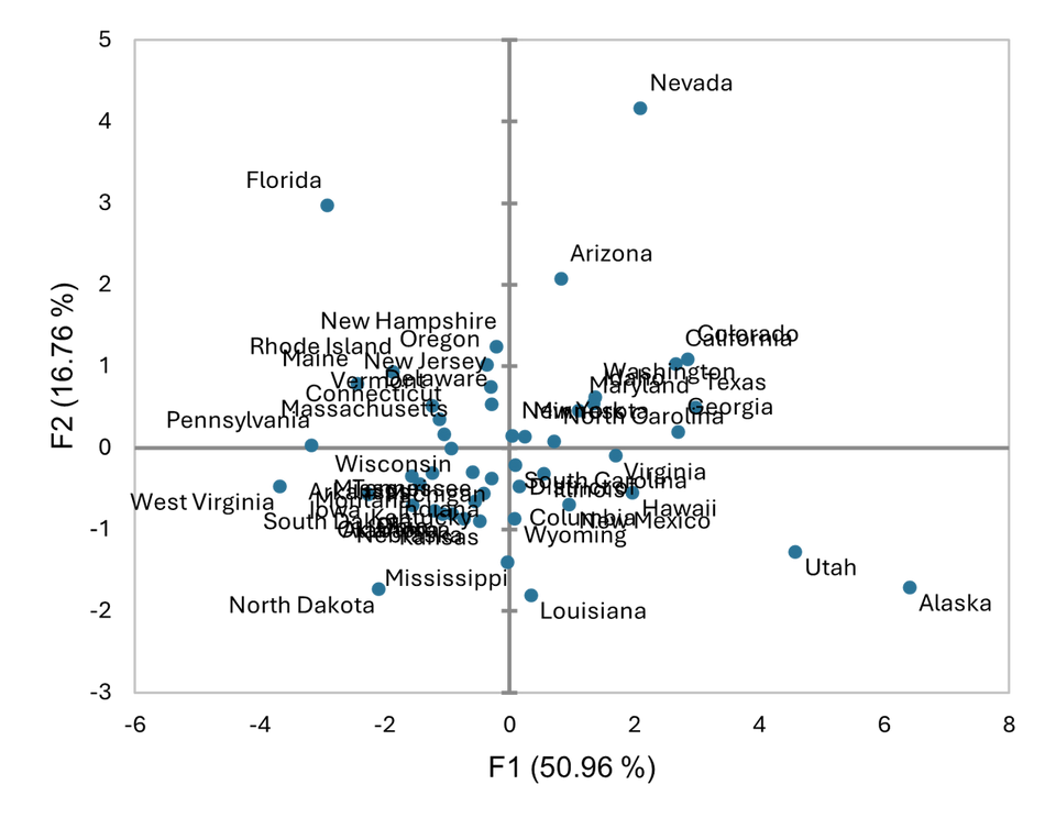 - Pennsylvania と Alaska は離れており、特徴が大きく異なる