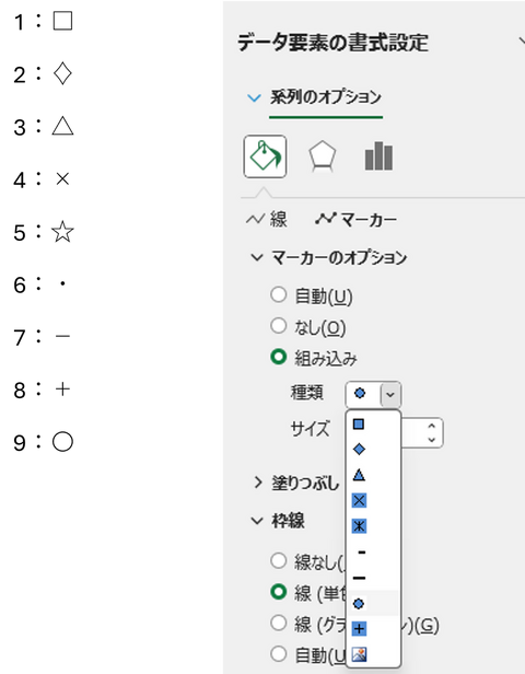 ※このコード番号は、後で マーカーの形状・色を自動で変更 する際に使用します。Excelでは以下の形状に対応します: