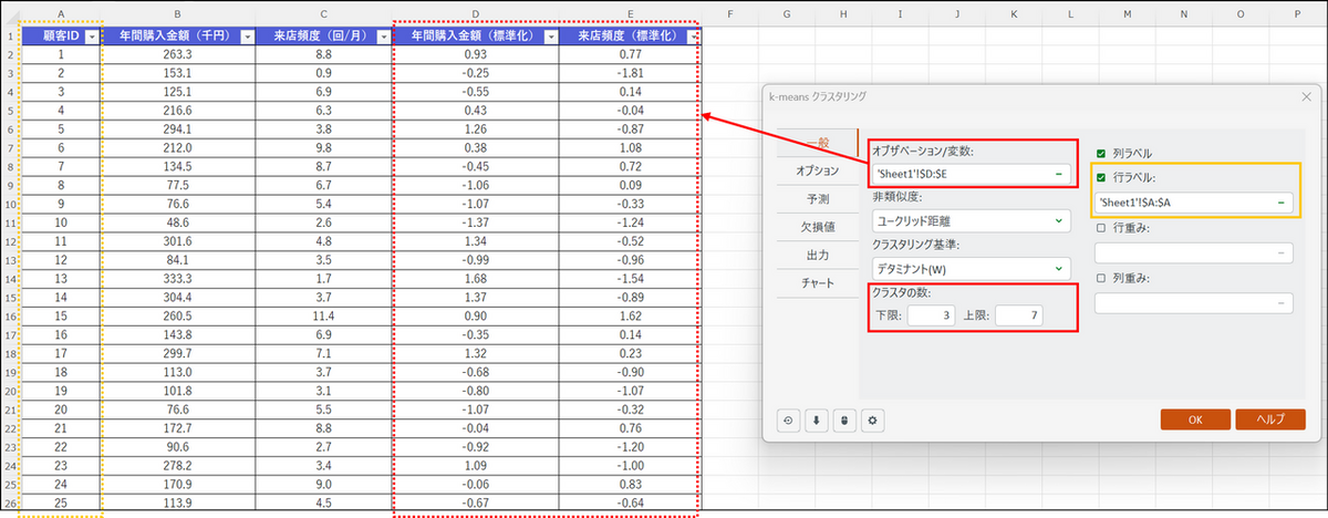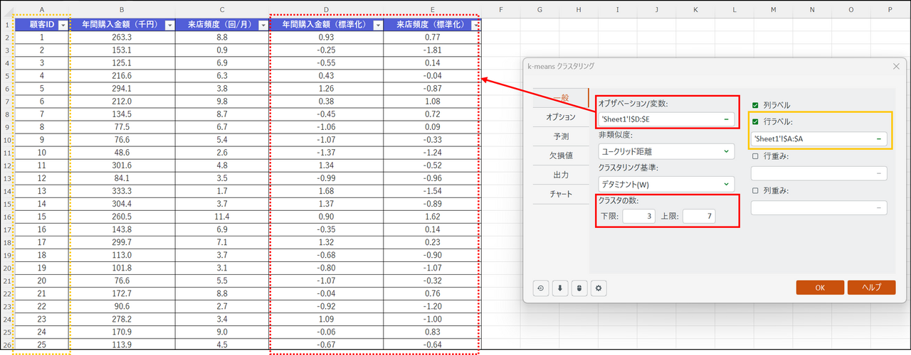 また、年間購入金額と来店頻度のデータは単位が異なるため、あらかじめ各データを標準化しておきます。XLSTAT でデータを標準化する方法は下記ページをご参照ください。