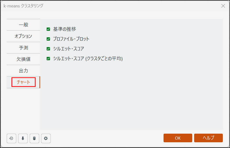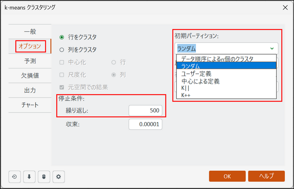k-means クラスタリングを実行する際は、初期クラスターの中心がランダムに設定される点に注意が必要です。不適切な初期値が選ばれると、クラスタリングがうまくいかなかったり、収束に時間がかかってしまうことがあります。この問題の対処法の1つは、結果を慎重に解釈し、必要に応じて複数回クラスタリングを実行することです。もしくはk-means++ を選択することで、初期値を互いに離れた位置に配置し、通常のk-means 法よりも効果的で、一貫性のある結果が得られる可能性があります。k-means++ で実行する場合は、初期パーティションから[K++] を選択します。