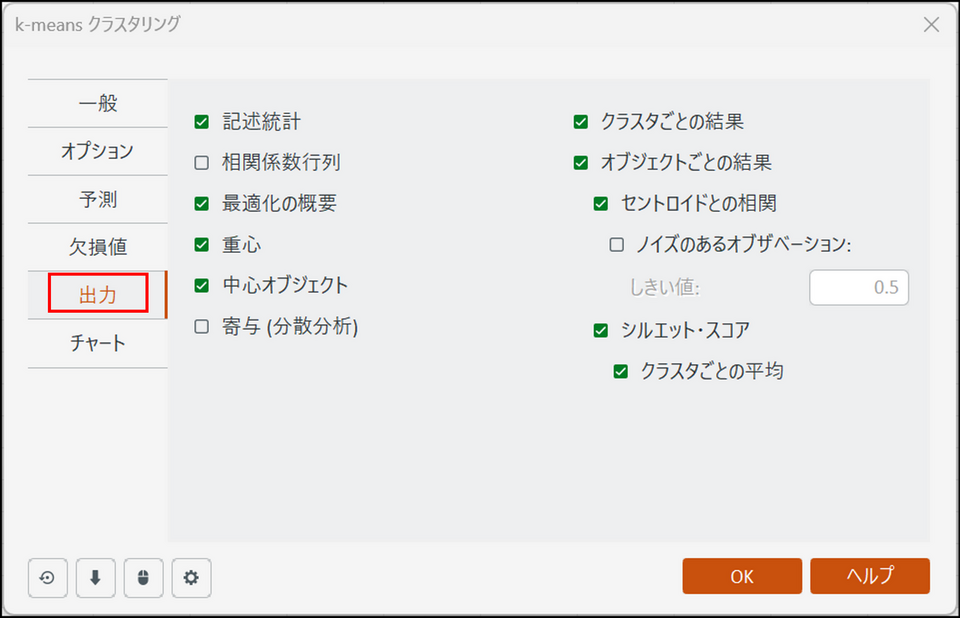 [ユークリッド距離] を選択 - クラスタリング基準: