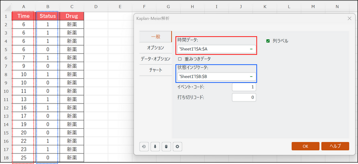 カプランマイヤー曲線を実行するためには、2種類のデータが必要になります。