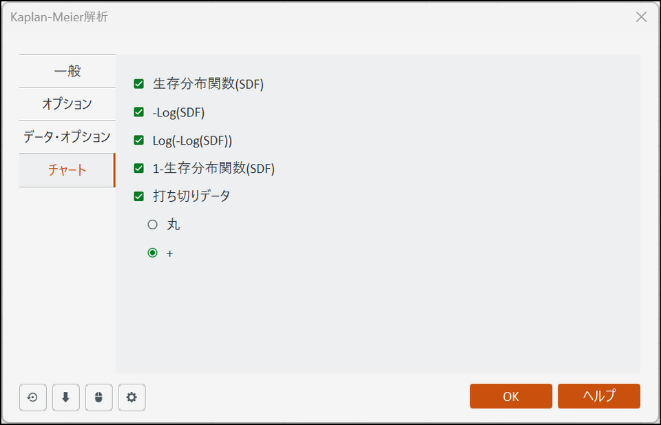 [チャート] タブに切り替え、すべての項目にチェックを入れます。また、打ち切りデータのマークは「+」を選択します。