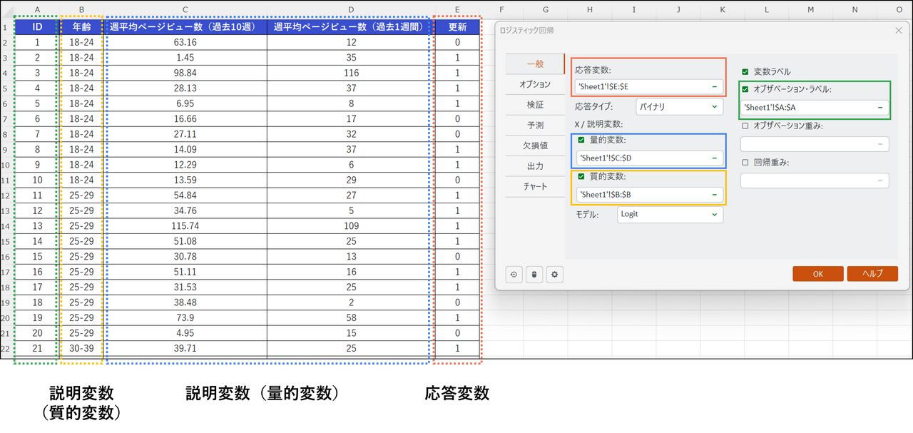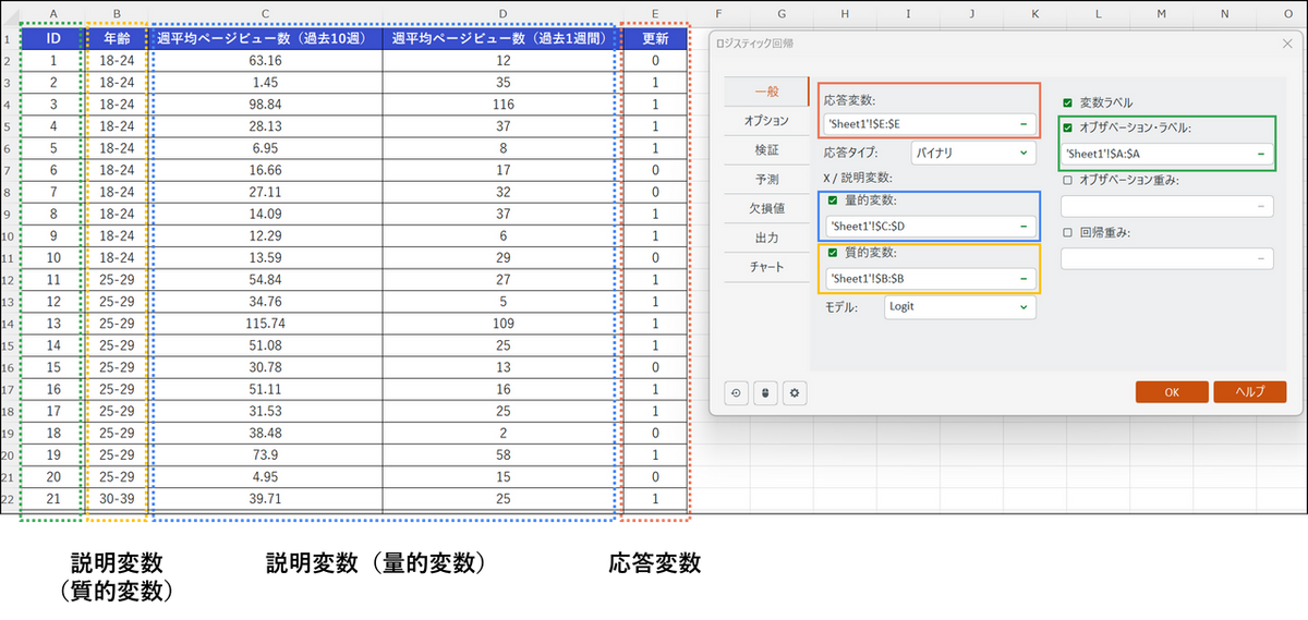 予測したい変数。今回は「更新」のデータ列を選択します。 - 応答タイプ:[バイナリ] を選択します。