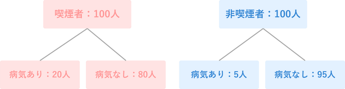 - 非喫煙者グループ(100人): 病気になった人 5人、ならなかった人 95人