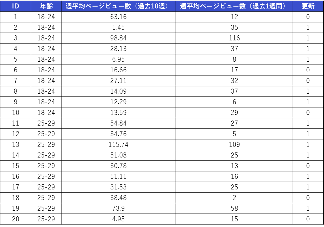 - 更新:ユーザーがサービスを更新したかどうか(1 = 更新, 0 = 更新しない)