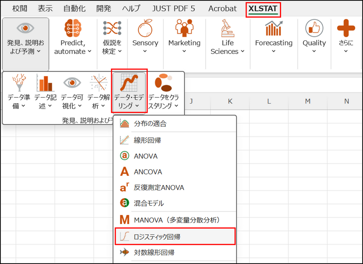 XLSTAT を起動し、[発見、説明および予測] > [データ・モデリング] > [ロジスティック回帰] を選択します。