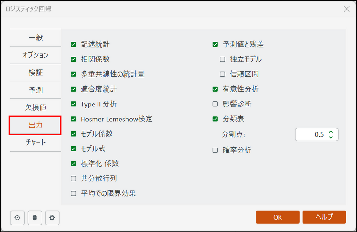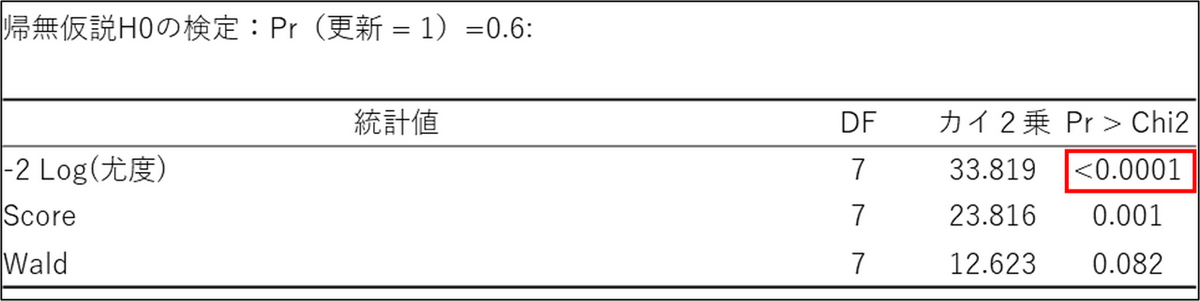 通常、Pr > Chi2 (p値) の値が0.05(5%)より小さい場合に「統計的に有意」と判断します。結果を確認すると、尤度比検定のp値が <0.0001 と非常に小さいため、帰無仮説は棄却されます。したがって今回作成された予測モデルは、説明変数を全く使わないモデルよりも、統計的に有意に予測精度が高く、モデル全体として意味のあるものだと判断できます。