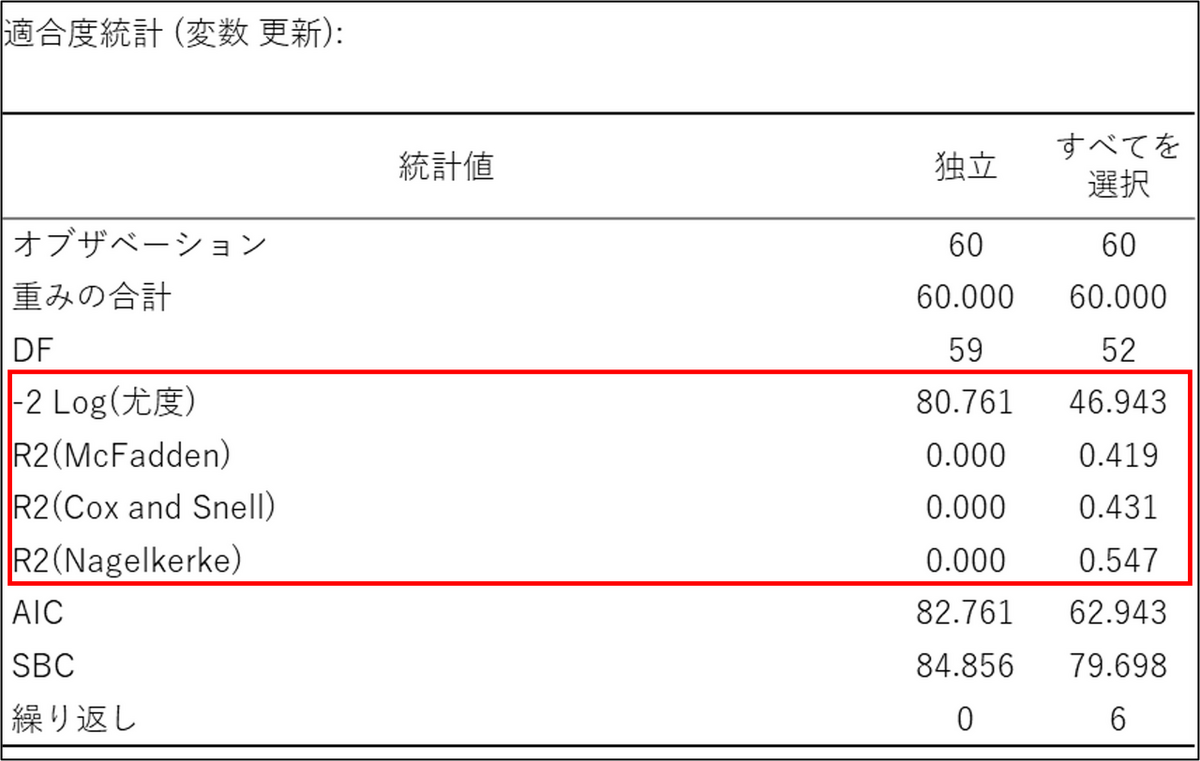 通常の決定係数(R2)の計算の考え方を、ロジスティック回帰に応用しようと試みた指標です。モデルの当てはまりが良いほど値が高くなりますが、この指標には「最大値が1にならない」という性質があります。 - R2 (Nagelkerke) - 最もR2 に近い感覚で使える改良版
