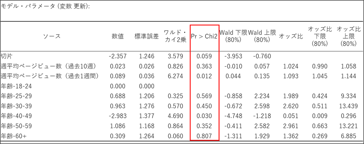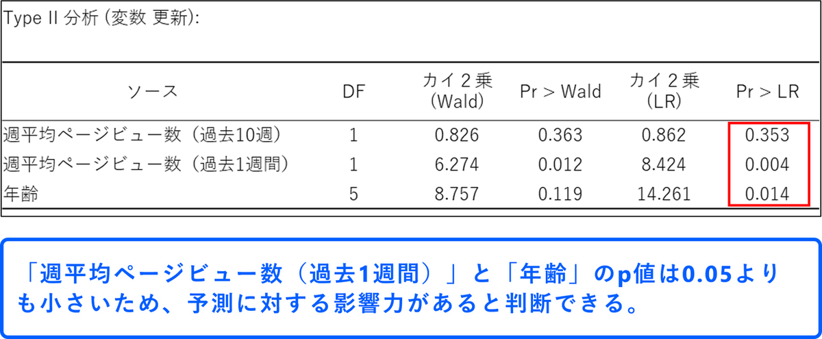 この分析でも、各変数に対して「この変数は予測に役立っていない(係数が0である)」という帰無仮説を立て、p値(「Pr > Wald」や「Pr > LR」)を計算します。ここでもp値が十分に小さい(一般的に0.05未満)変数は目的変数に「有意な影響を与えている」と判断されます。