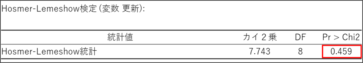 ホスマー・レメショウ検定(Hosmer-Lemeshow test)は、作成されたモデルの「当てはまりの良さ(適合度)」を評価するためのものです。この検定では、p値(Pr > Chi2)が非常に重要になります。
