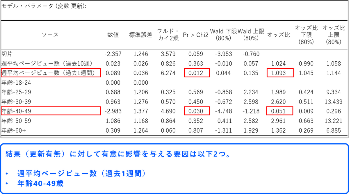 結果を確認すると、「週平均ページビュー数(過去1週間)」と「年齢」は、尤度比検定(Pr > LR)のp値がどちらも基準となる0.05を下回っており、このモデルにおいて重要な変数であることが示唆されます。一方で、「週平均ページビュー数(過去10週)」のp値は0.353と、0.05を大きく上回っています。これは、この変数をモデルに加えても、予測精度はほとんど改善しないことを意味します。したがって、このモデルの中では、「更新」という行動を予測する上で、この変数の重要度は低いと判断できます。このように、Type II 分析はモデルの「中身」を精査し、結果に影響を及ぼす要因を見つけ出すための重要な手がかりを提供してくれます。
