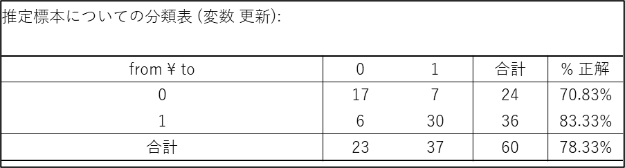 この表は、分類表または混同行列と呼ばれるもので、作成したモデルの「予測精度」を評価するための成績表です。結論から言うと、このモデルは全体として78.33%の正解率を持っており、特に「更新した人」を正しく予測するのが得意なモデルであると言えます。