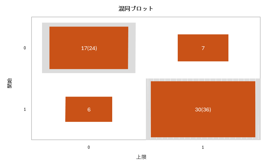 実際に更新しなかった(開始=0) 24人のうち、17人を正しく「更新しない(上限=0)」と予測できたことを示します。 - 右下の箱 30(36):