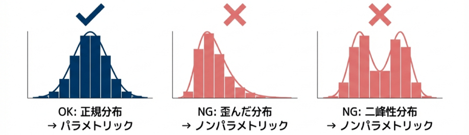 「データの分布形状に不安がある場合」や「サンプルサイズが小さい場合」は、より安全な選択肢としてノンパラメトリック検定を採用するのが定石です。