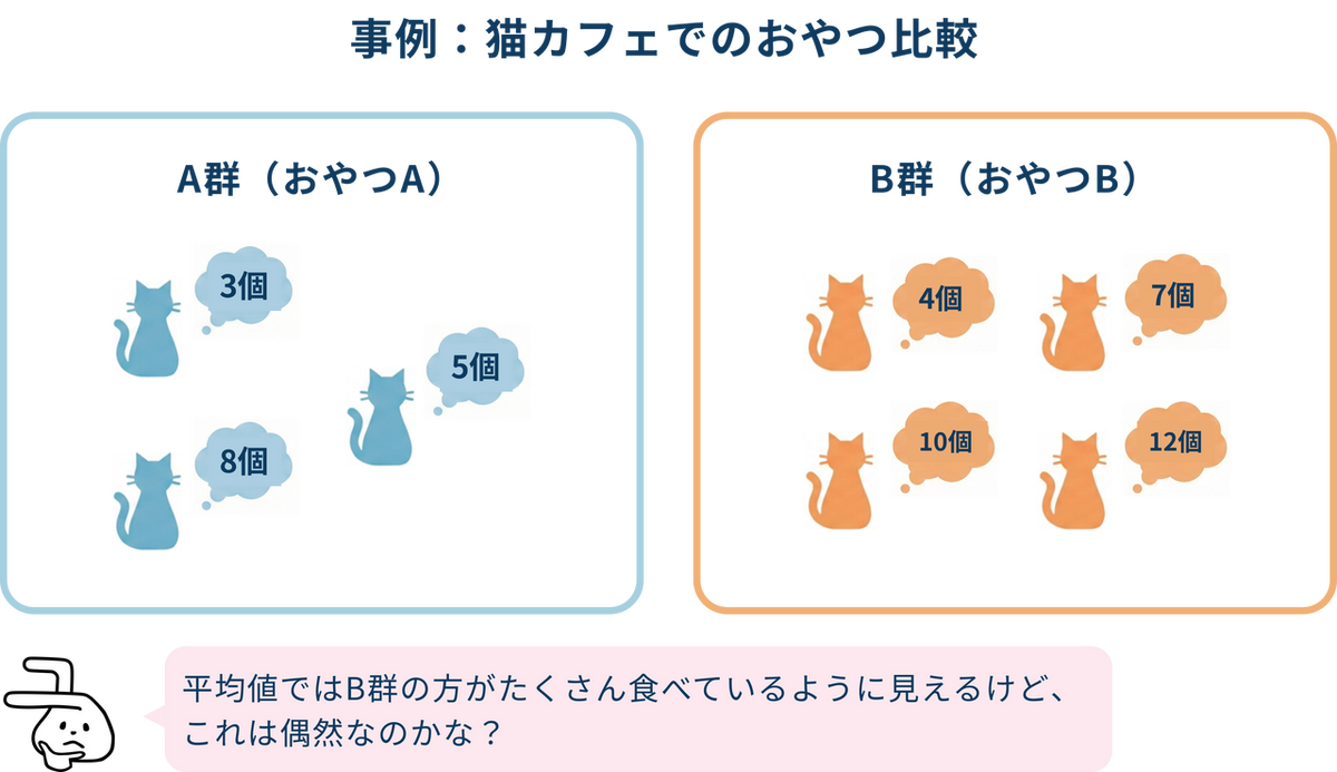 - グループB(おやつB):4匹の猫が食べた個数 → 4個、7個、10個、12個(n=4)