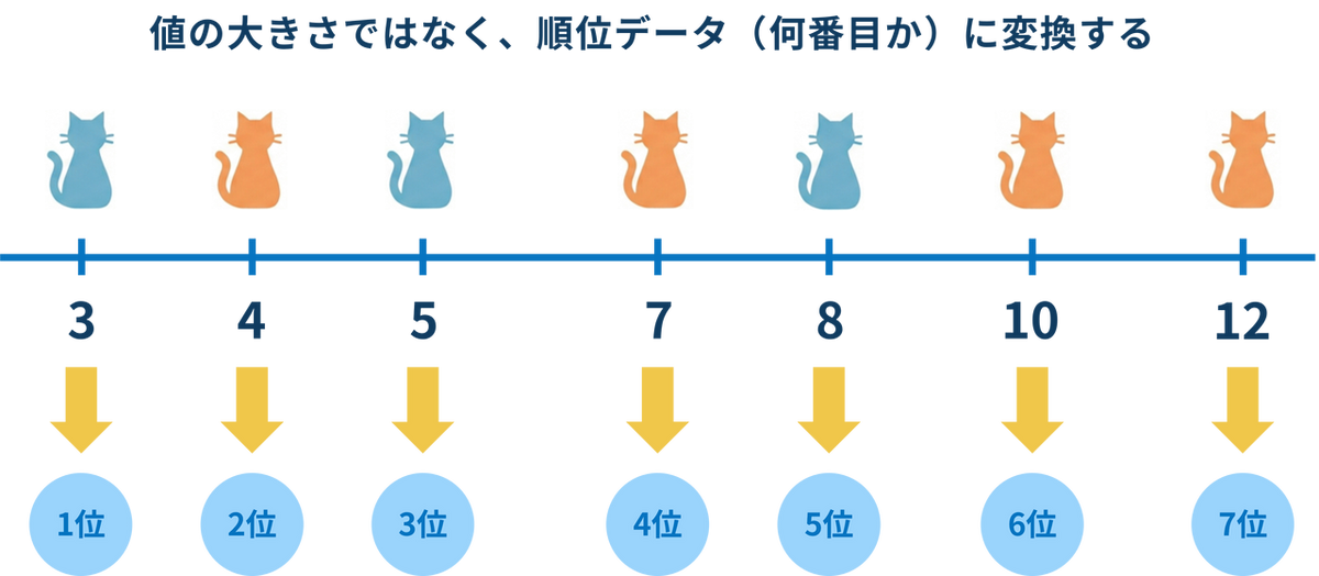 母集団が特定の分布に従っていることを仮定しません(分布によらない)。データの「値」そのものではなく、「順位」や「大小関係」に着目して分析を行います。データ数が少ない場合や、極端な外れ値がある場合、あるいはアンケートの評価段階のようなデータに対しても、ロバスト(頑健)な結果を得ることができます。