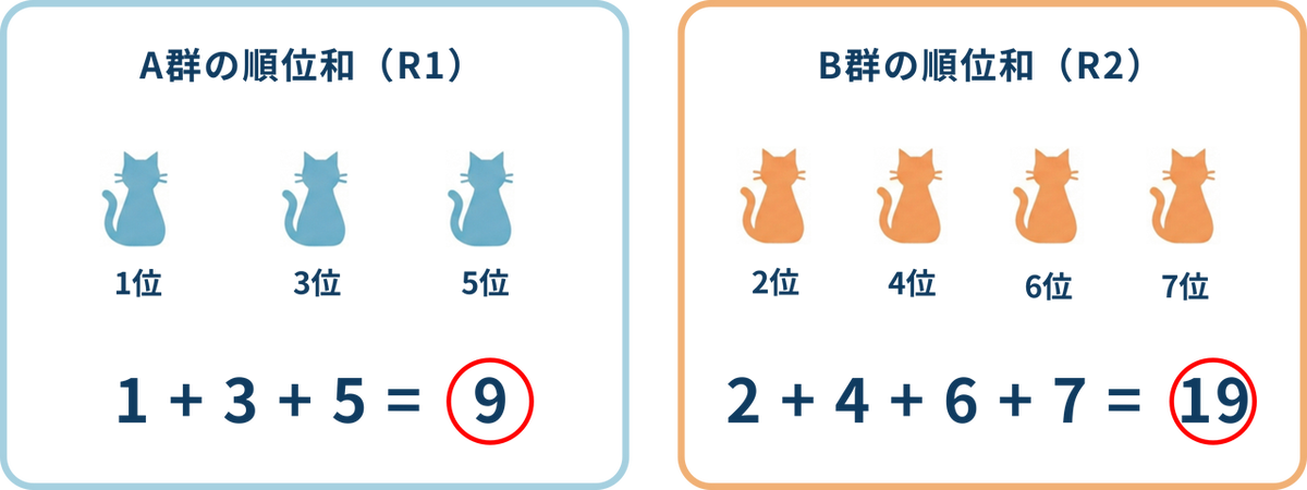 それぞれのグループの「順位」だけを足し算します。これを「順位和」と呼びます。