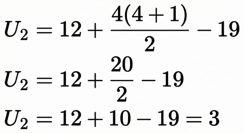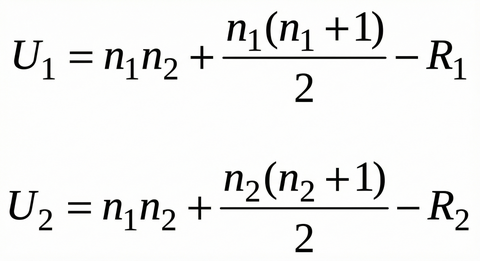 公式に当てはめて検定統計量Uを計算します。少し複雑に見えますが、四則演算で求められます。