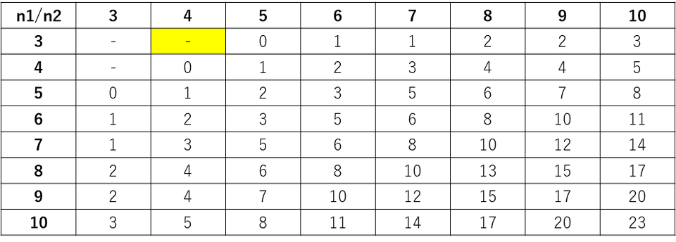 マン・ホイットニーのU検定では「計算した値が、表の値より小さい」ときに「有意差あり」となります。検定表で「3」と横の「4」が交わるところは「-」 です。これはサンプルサイズが小さすぎるため、U値が「0」であっても統計的に有意な差(5%未満)が出ないことを意味します。仮に0 であってもU=3 は基準値(0)よりも大きいため、「今回のデータだけでは、おやつB の方が人気があるとは断定できない(有意差なし)」という結果になります。このように、データ数が少ないときは、かなり極端な順位差(U値が0や1になるような状態)がないと、統計的に「差がある」とは認められにくいことがわかります。