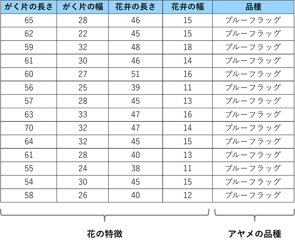 オリジナルのデータセットには150本の花と3つの品種が含まれていますが、このチュートリアルではブルーフラッグとバージニアアイリスという2つの品種のみを抽出して使用します。