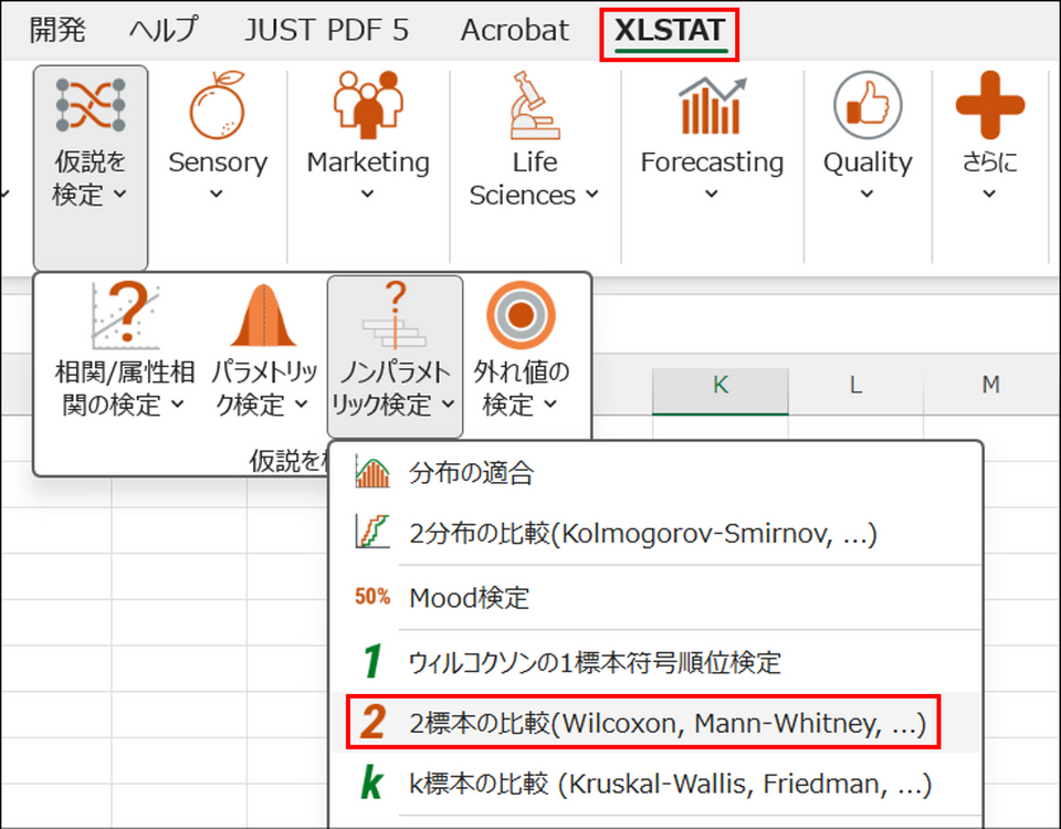 XLSTAT を起動し、[仮説を検定] > [ノンパラメトリック検定] > [2標本の比較 (Wilcoxon, Mann-Whitney, ...)] を選択します。