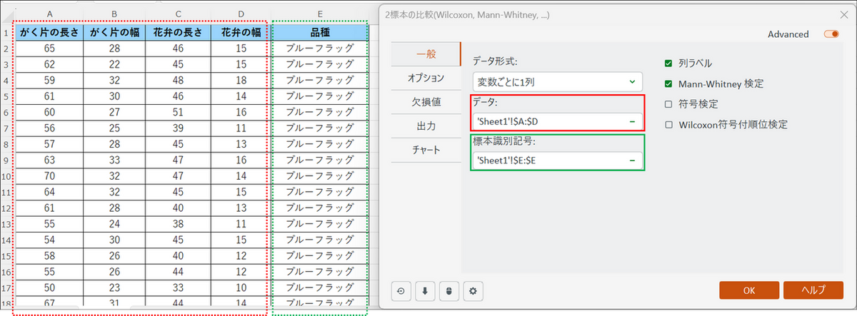 dataset-for-mann-whitney-u-test.xlsmマン・ホイットニーのU検定を実行する手順