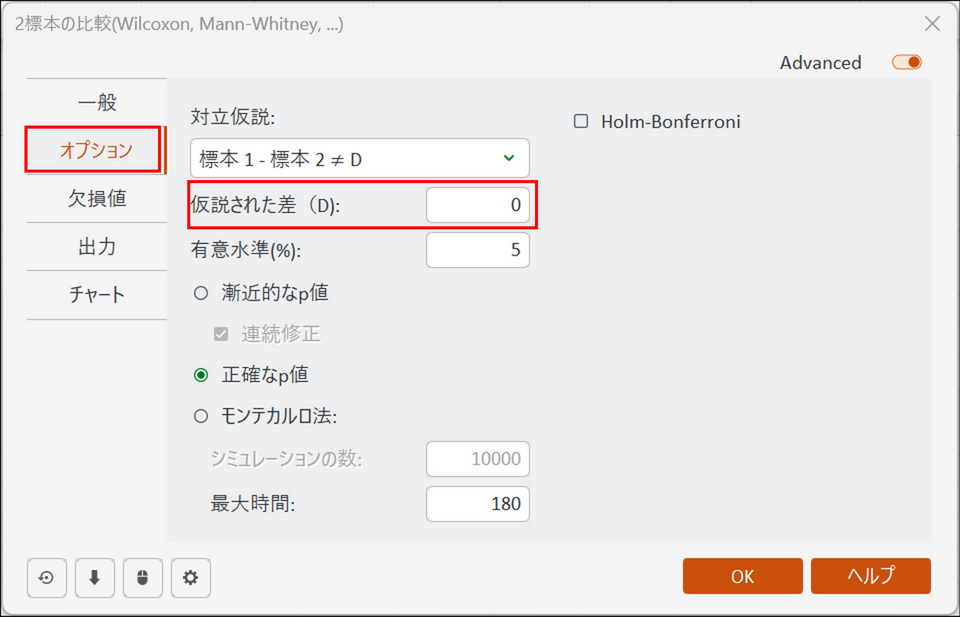 [オプション] タブに切り替え、[仮説された差 (D):] を「0」とします(「2つのグループに差はない」という前提で検定を始めます)。