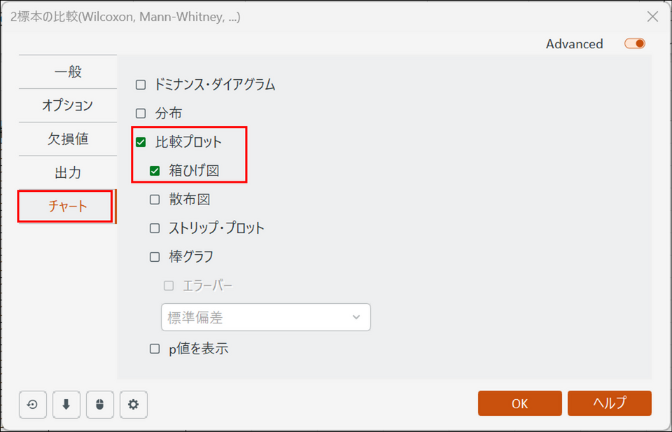 [チャート] タブに切り替え、[比較プロット] と[箱ひげ図] にチェックを入れます。