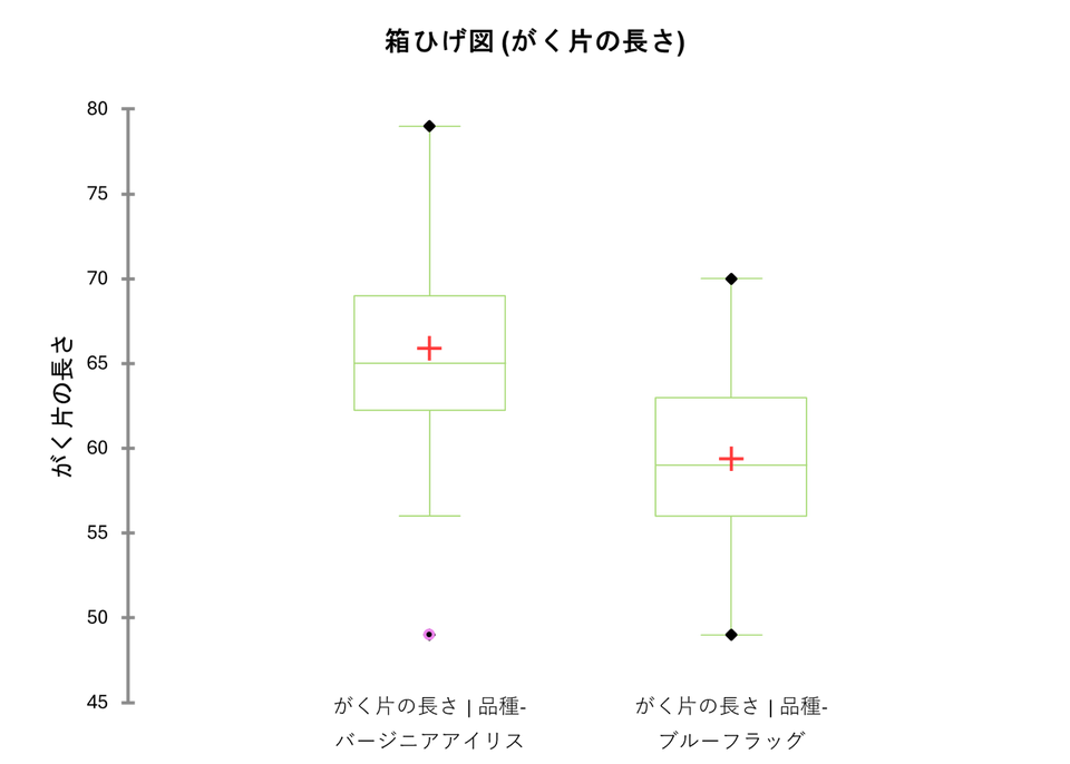 検定結果で「差がある」と出た場合、箱ひげ図を見ることで「どちらの品種の方が値が大きいのか」「データのばらつきはどうなっているか」を視覚的に確認できます。今回の例では、検定結果の通り、2つの品種の分布の位置がズレている(差がある)ことがグラフからも読み取れます。