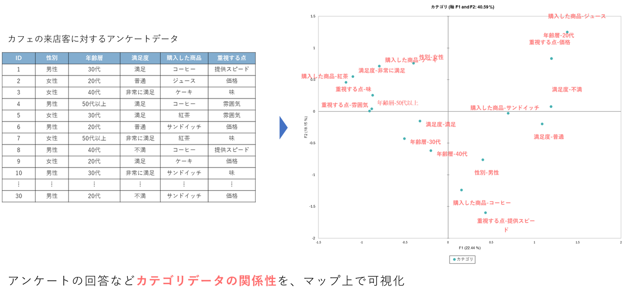 例えば、1行目の「全体満足-いいえ」は、マップ上で(F1 = -0.871, F2 = 0.105)の位置にプロットされます。それに対して、2行目の「全体満足-はい」は、(F1 = 0.754, F2 = -0.091)の位置にプロットされます。このことから両者はF1 軸(横軸)上で正反対の遠い位置にあり、対立的な回答であることを示しています。また、「全体満足-はい」(F1 =0.754)と「価格満足-はい」(F1 =1.117)は、F1 の値が両方ともプラスで近いため、マップ上で近くにプロットされ、関連が強いと解釈できます。