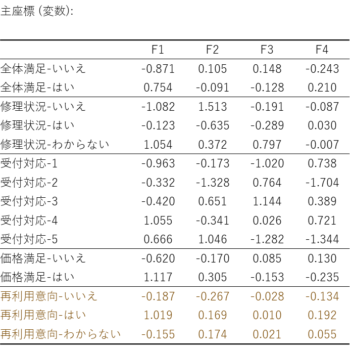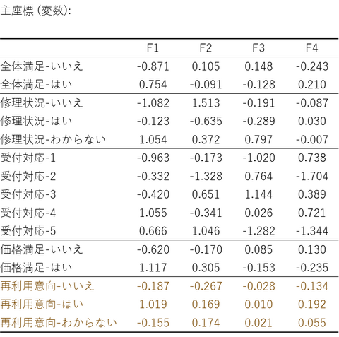 これは、多重コレスポンデンス分析のマップを作成するための「座標」を示した表です。F1 をX軸、F2 をY軸、F3 をZ軸...と考えたときに、各アンケート回答(カテゴリー)がマップ上のどの位置にプロットされるかを示しています。