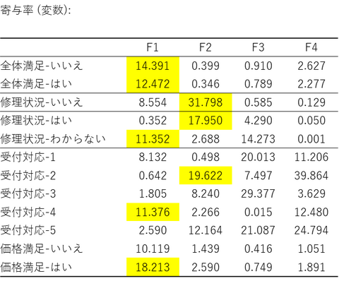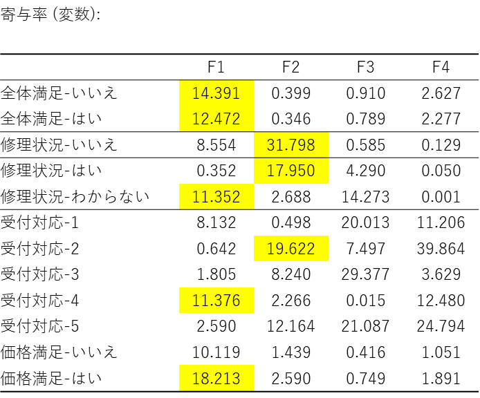 これらのカテゴリーが、F1(横軸)の「位置決め」に最も強く貢献しています。 前の「主座標」の表と合わせると、F1 のプラス側には「価格満足-はい」や「全体満足-はい」が、マイナス側には「全体満足-いいえ」が来ていました。 つまり、F1 軸は「サービスや価格に対する総合的な満足度」を表す軸であると解釈できます。
