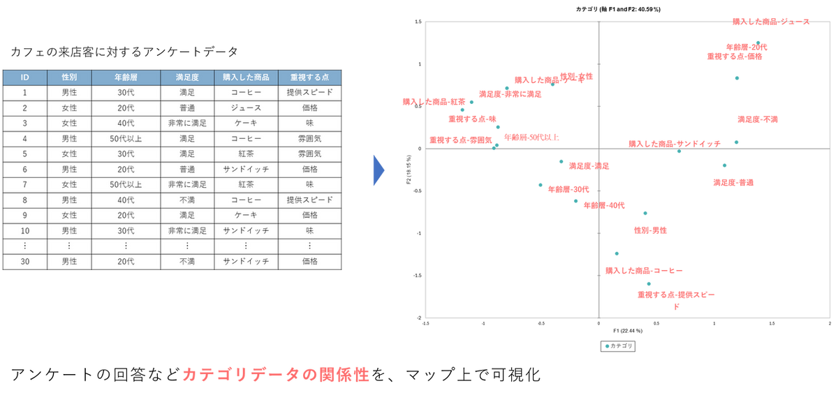 | 分析例 | 「好きなブランド」(A, B, C)と「年齢層」(10代, 20代, 30代)の関係性。 | 「性別」「年齢層」「好きなブランド」「購入頻度」「重視する点」の5つの質問項目全体の関連性。 |