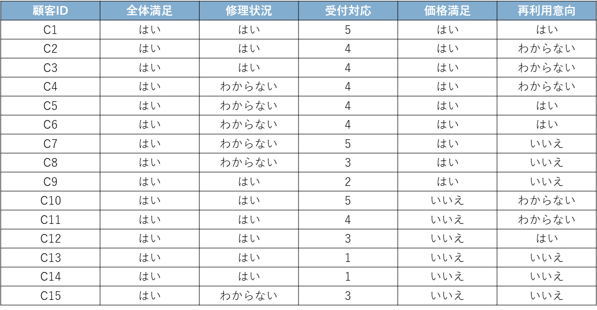 今回は、ある自動車ディーラーが顧客28名に対して行った架空のアンケートデータを使用します。顧客は、車の修理を終えてから1週間後に、以下の5つの質問に回答しました。
