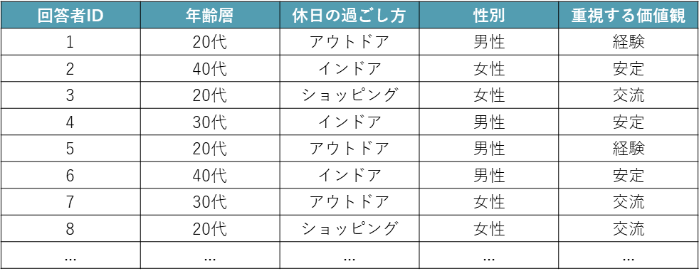 多重コレスポンデンス分析は、3つ以上のカテゴリ変数を同時に扱うため、クロス集計表の形にまとめられません。そのため、個体 x 変数の生データ(観測値/変数テーブル)を入力データとして用います。