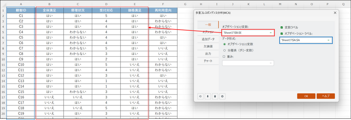 分析に使用するデータ列(「全体満足」「修理状況」「受付対応」「価格満足」の列)を選択します(ポイント:ここでは「再利用意向」の列は含めません)。 - 変数ラベル:チェックを入れます。