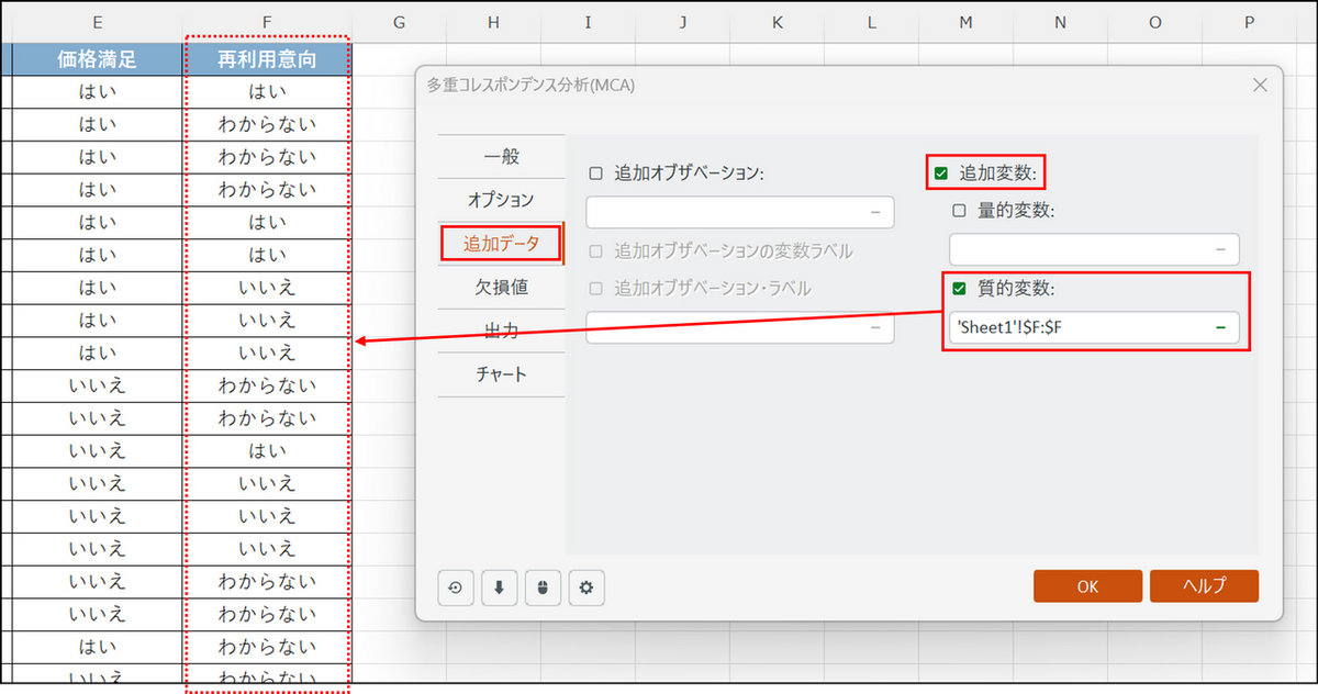 [追加データ] タブに切り替え、[追加変数] と[質的変数] の項目にチェックを入れ、「再利用意向」の列を選択します。