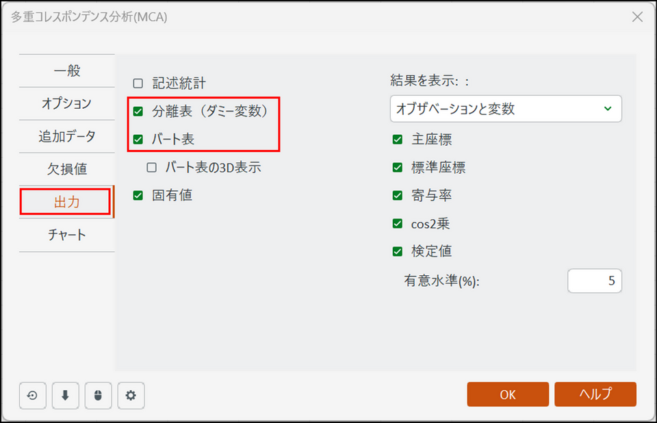 [出力] タブに切り替え、「分割表(ダミー変数)」と「バート表」の項目にチェックを入れます。