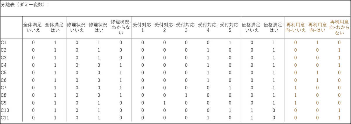 元のアンケートデータ(「はい」「いいえ」「1」「5」など)を、多重コレスポンデンス分析で計算できる形式に変換した「0」と「1」の表です。各回答者がどのカテゴリーを選んだか(1)、選んでいないか(0)を示します。