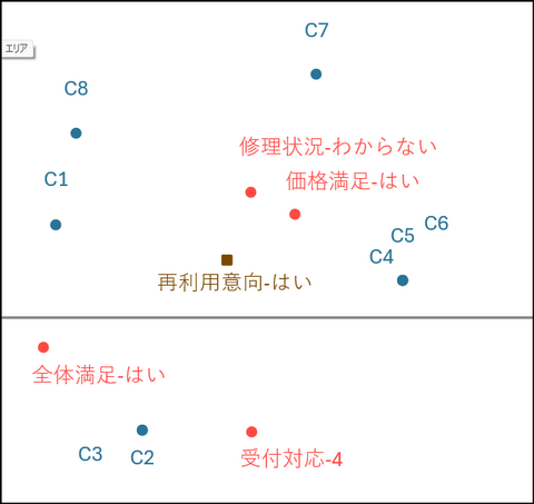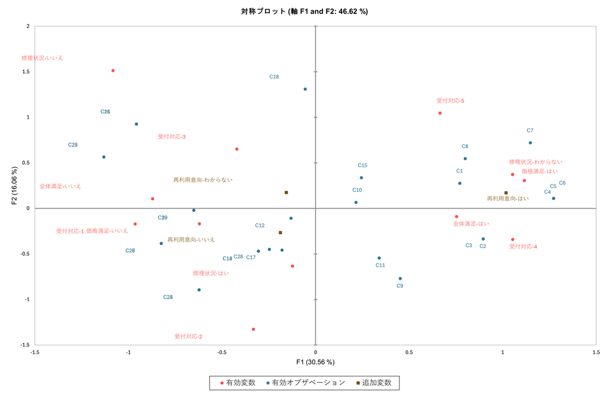 これは、分析の「土台(軸)」を「サービス体験(満足度、受付、価格など)」だけで作り、そのマップ上に「結果(再利用するかどうか)」がどこに位置するかを後から確認するためです。これにより、「どのような体験をした人が、再利用(はい)と答えているか」という原因と結果の関係性が非常に明確になります。