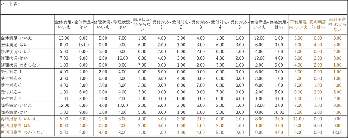 分析に使う複数のカテゴリ変数どうしの関係を、一つの大きな表としてまとめたものです。3つ以上のカテゴリ変数を同時に扱う場合、1枚のクロス集計表として整理することはできませんが、それぞれの変数どうしのクロス集計表を並べて(結合して)いくことでバート表が構成されます。例えば、「『全体満足-いいえ』と回答した人」のうち「『修理状況-いいえ』と回答した人」が何人いるか、といった同時出現回数が一覧になっています。