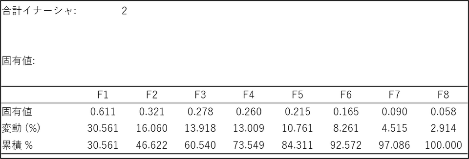 各軸(F1, F2...)がデータ全体のばらつき(イナーシャ)をどれだけ説明しているかを示します。「合計イナーシャ」は、分析におけるデータの「ばらつき」や「情報量」の総量(合計値)を示す数値です。後続の「固有値」の表にある全ての固有値を合計すると、ちょうど「合計イナーシャ」で示される値(「2」)になります。