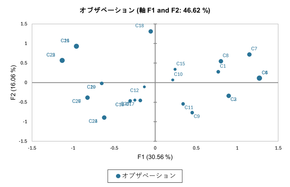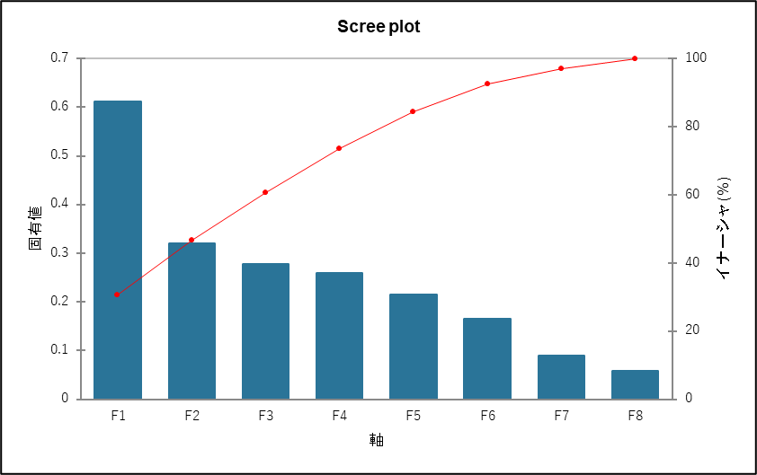 上記の固有値の表をグラフ化したものです。青い棒グラフは、各軸(F1, F2…)の固有値を示しており、F1 が最も高く、F2, F3 と進むにつれて減少しているのがわかります。赤い折れ線グラフは、累積寄与率を示しており、各軸までを合計した「情報量の割合」を示します。固有値の表で確認した通り、F2 軸上で累積寄与率は、約47%の位置にあることが確認できます。