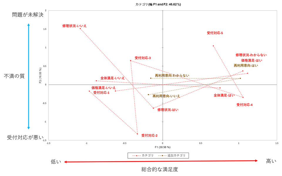 これらの寄与率が非常に高いことから、F2(縦軸)は主に「問題が解決されたかどうか」と「受付の対応(特に受付対応-2=悪い)」という要因によって定義されている軸だと解釈できます。