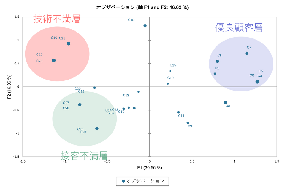 このグラフは、アンケートに回答した28名の顧客(C1〜C28)を、回答パターンの類似度に基づいて配置したものです。近くにいる顧客ほど似た回答をしており、軸の意味は前のグラフ同様、横軸が「総合満足度」、縦軸が「不満のタイプ(上:問題未解決、下:接客不満)」を表します。